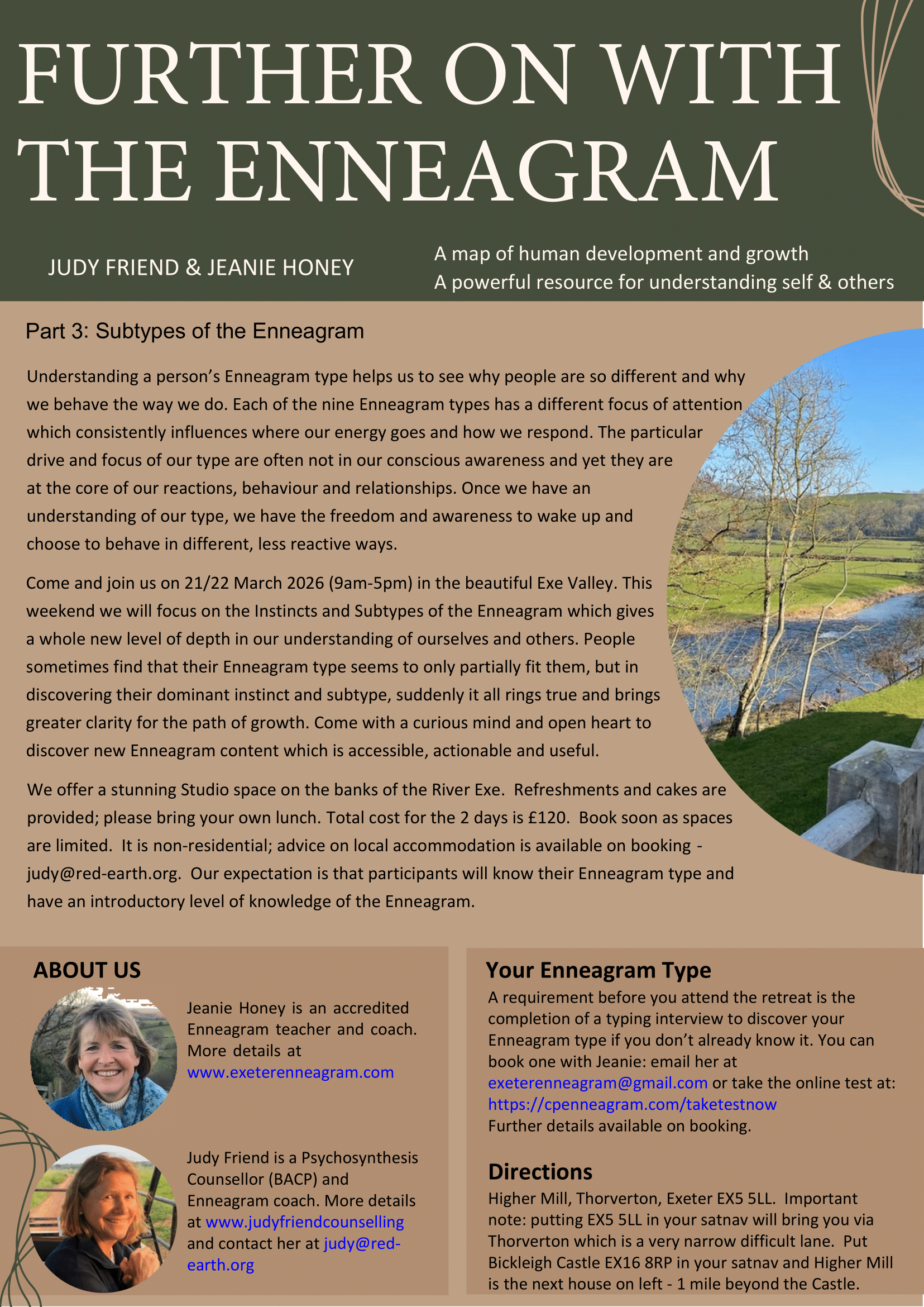 This weekend course is an exploration of the subtypes and instincts for those who want to go deeper in their understanding of themselves and others. Contact me at exeterenneagram@gmail.com for more information.